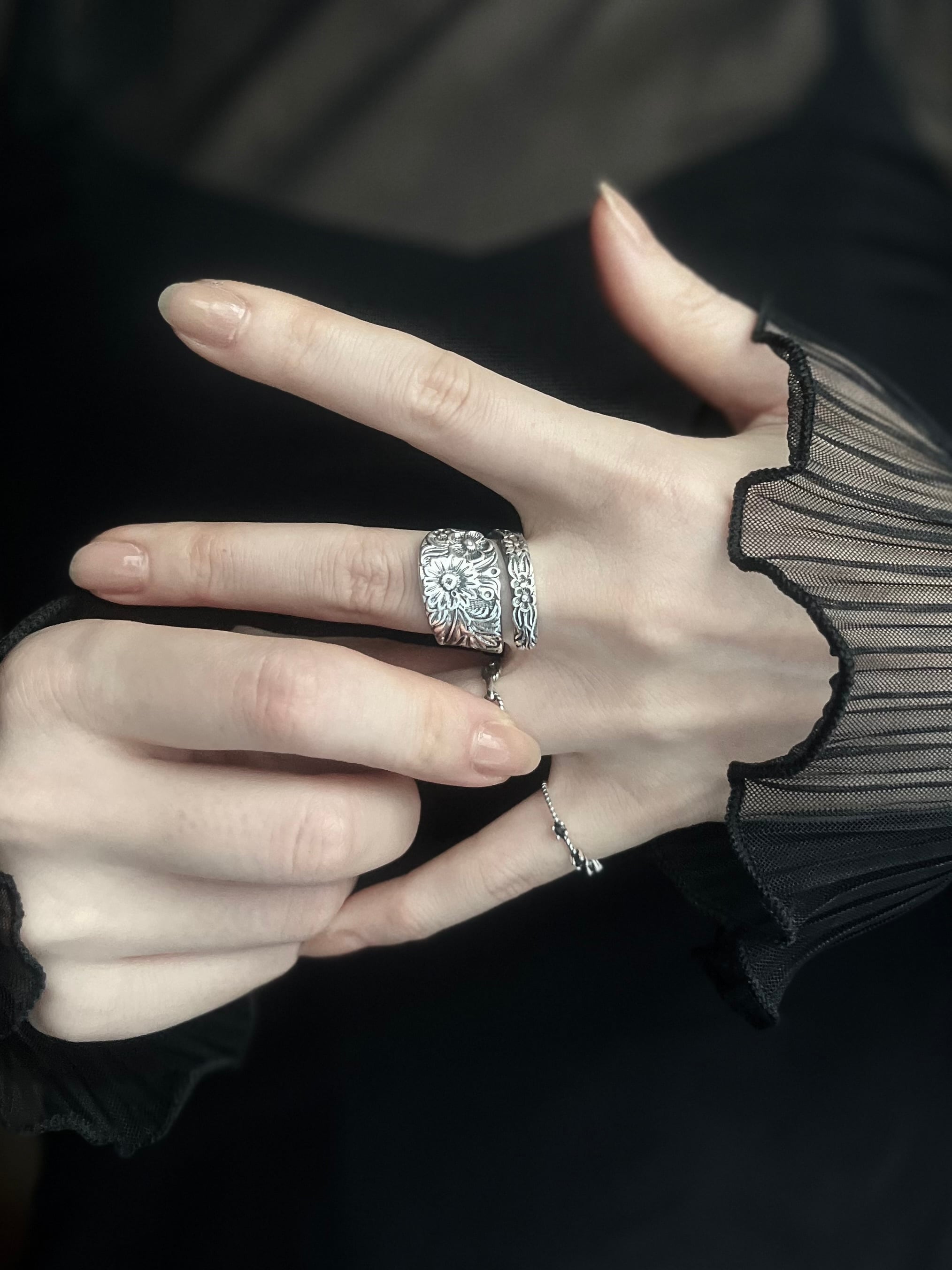 どこから見ても抜かり無いデザインが魅力のヴィンテージライクなフラワーデザインリング。