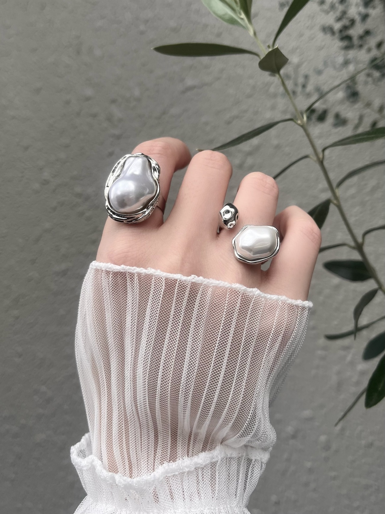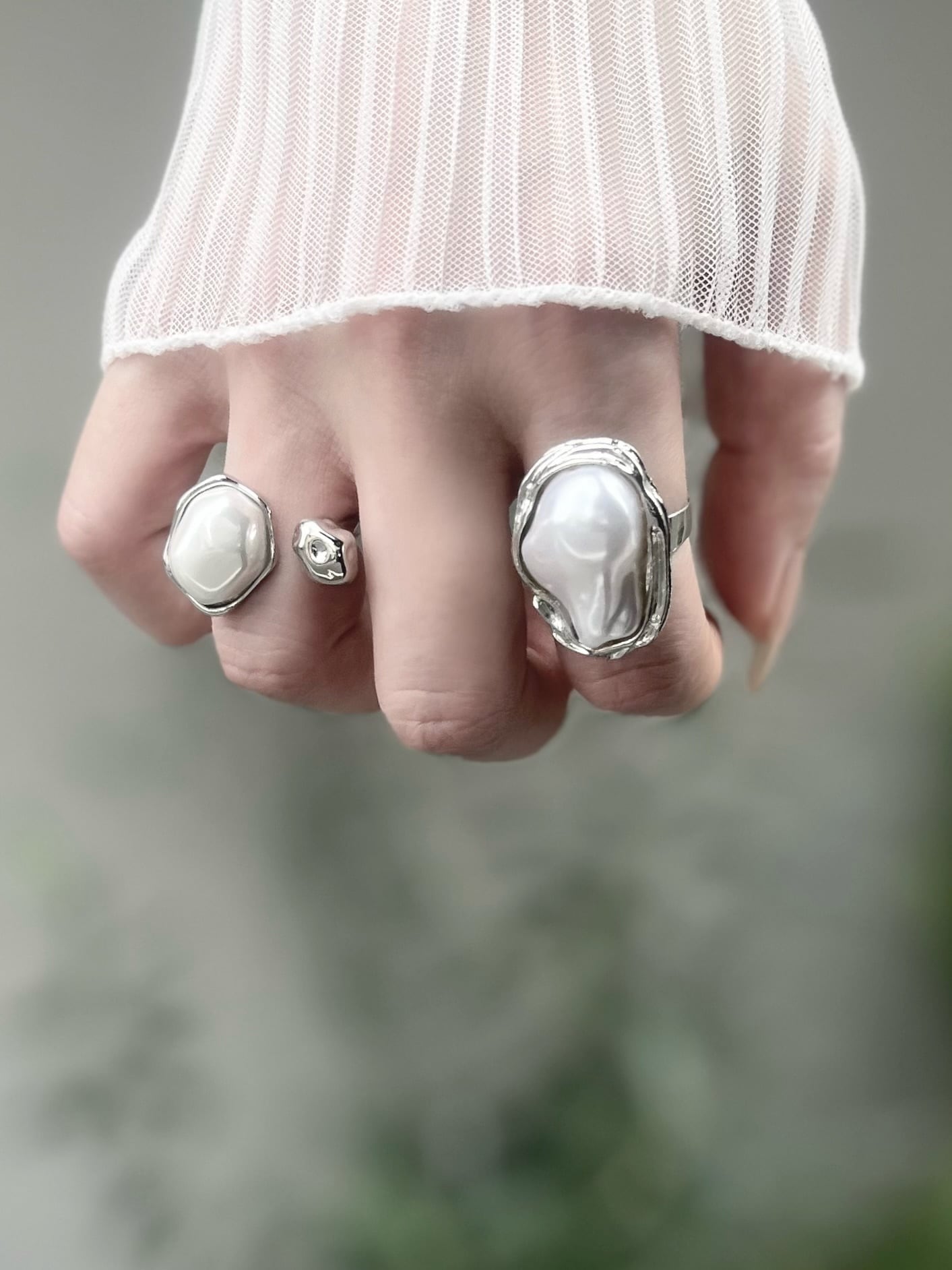 多面的にカットデザインされたパールとシルバーのアシンメトリーが