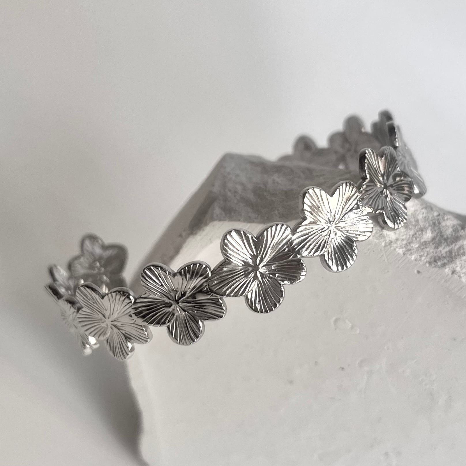立体的に刻まれたフラワーモチーフが光を受けて上品に輝き、