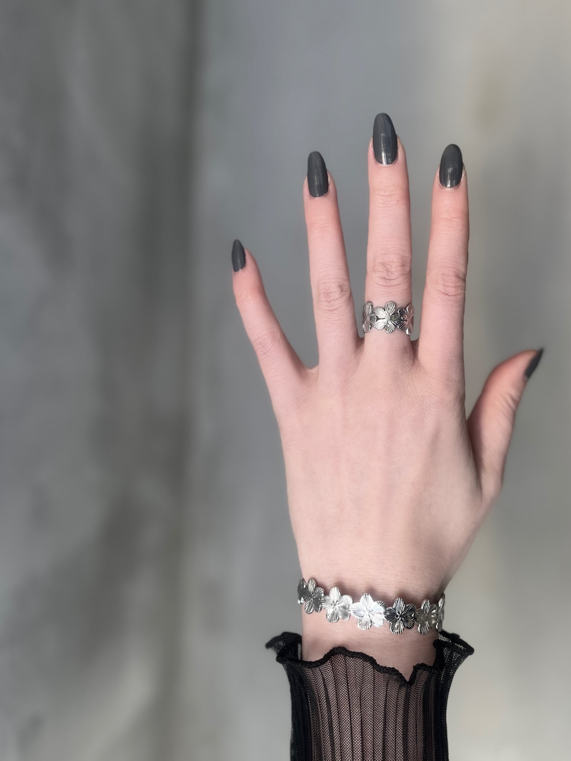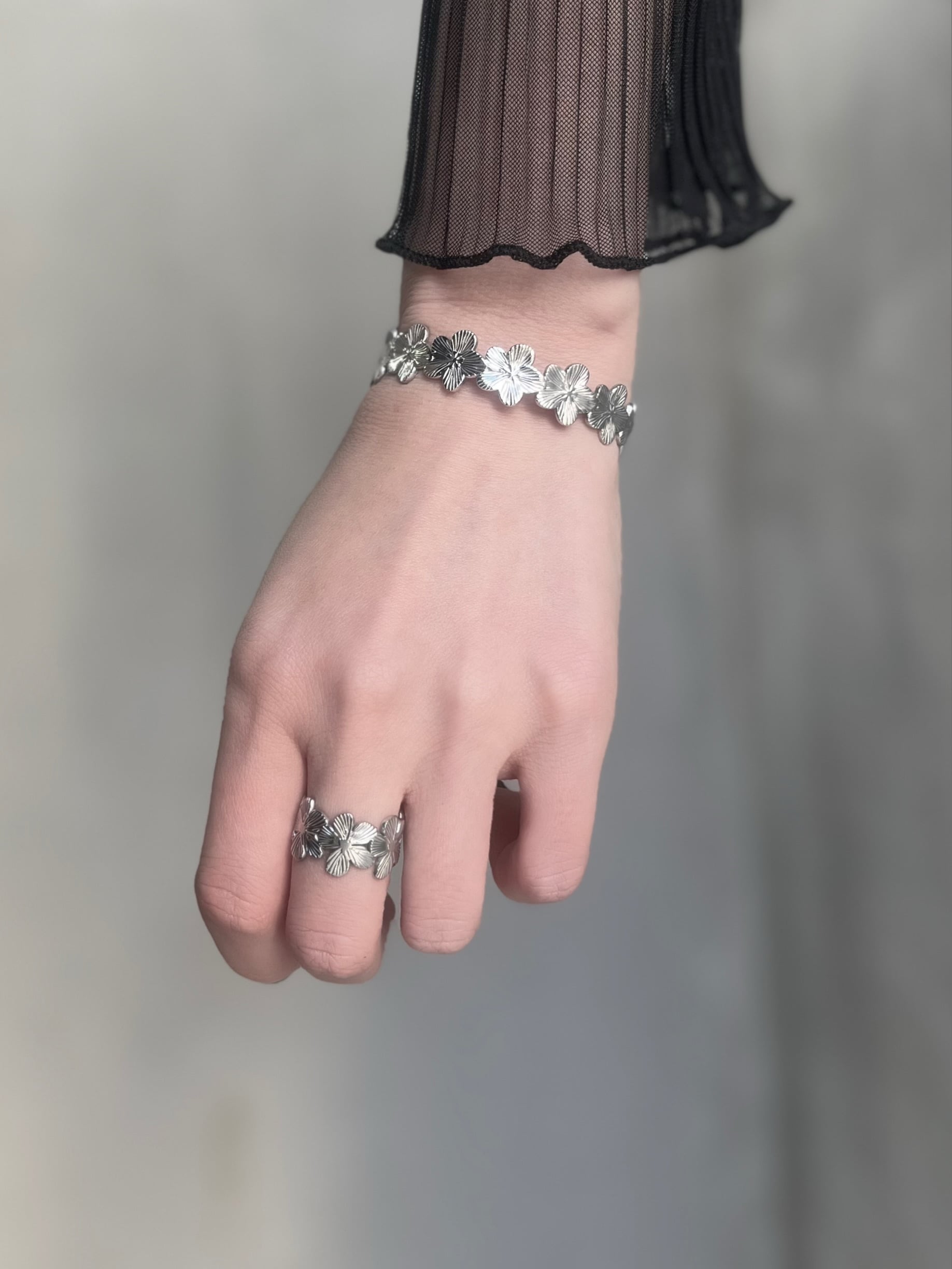 立体的に刻まれたフラワーモチーフが光を受けて上品に輝き、