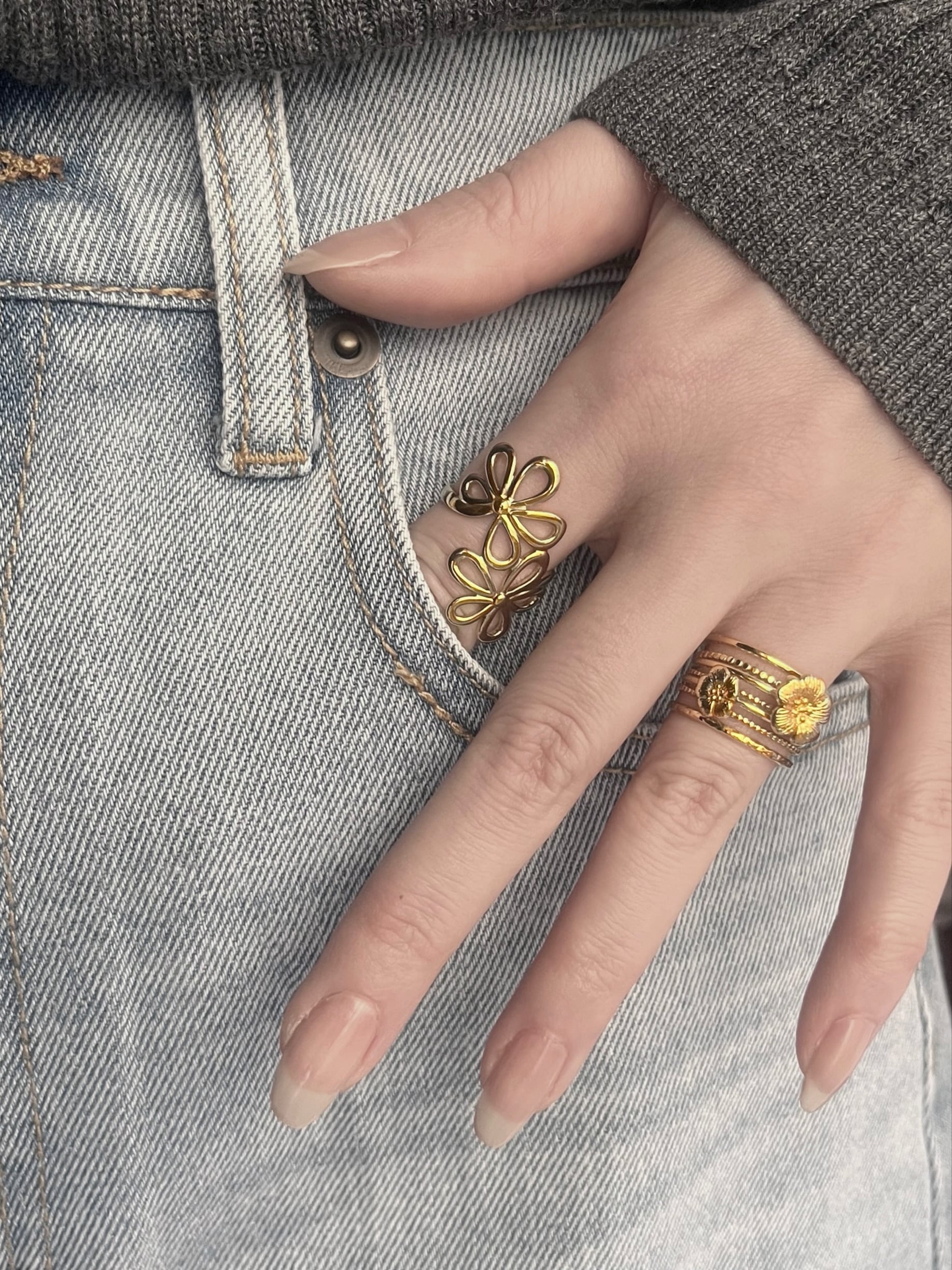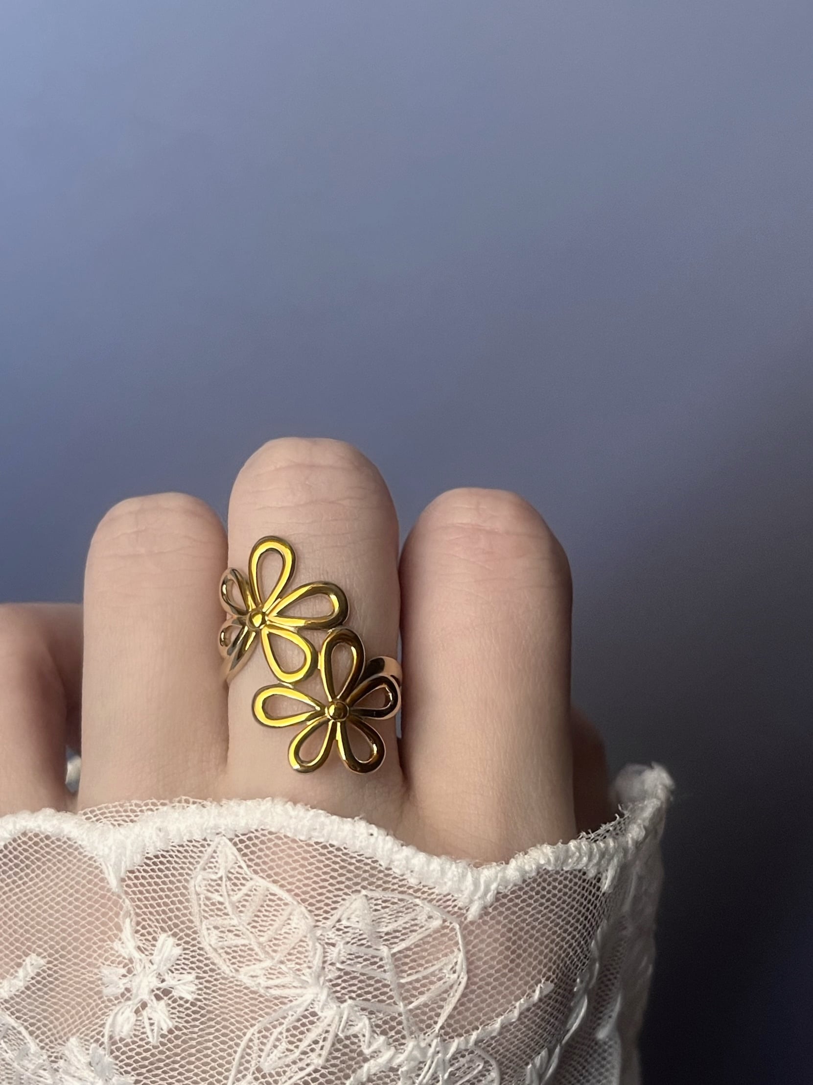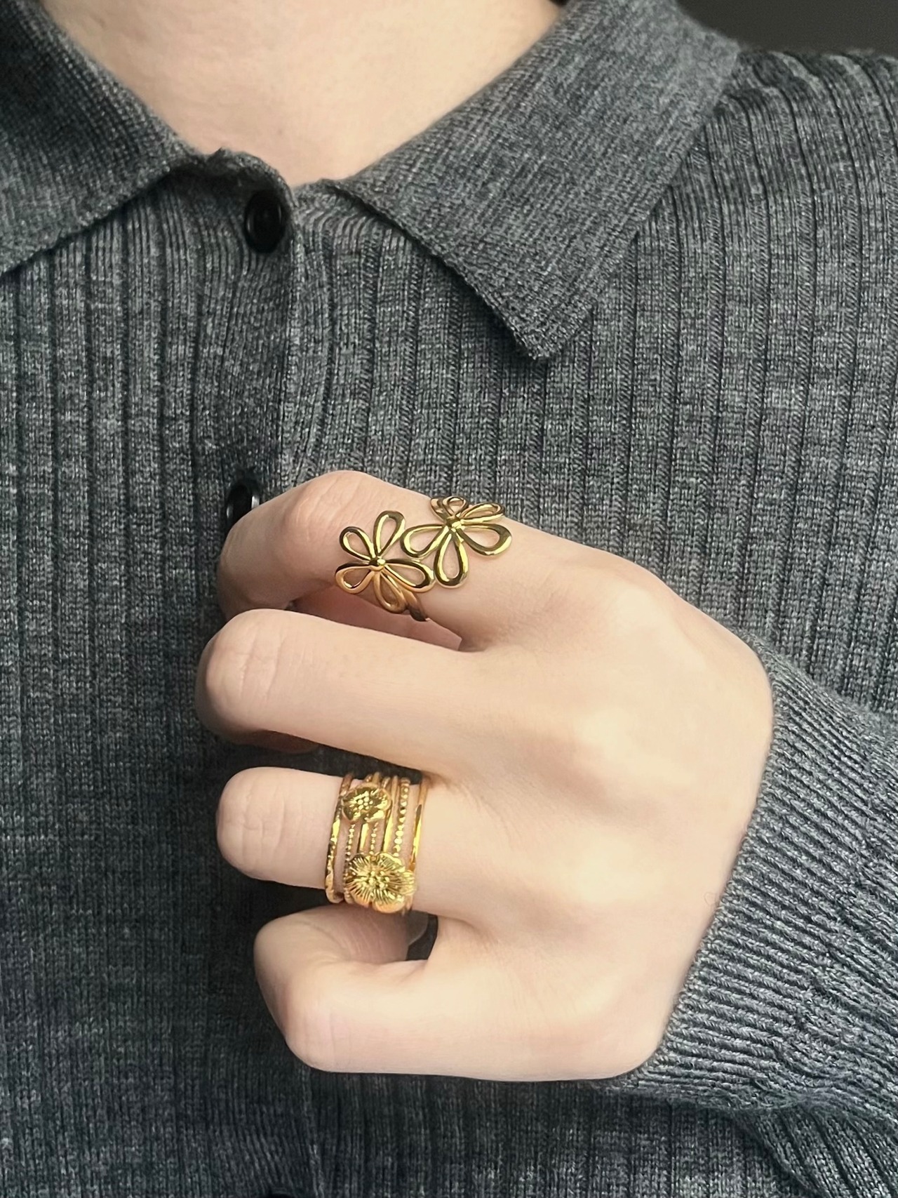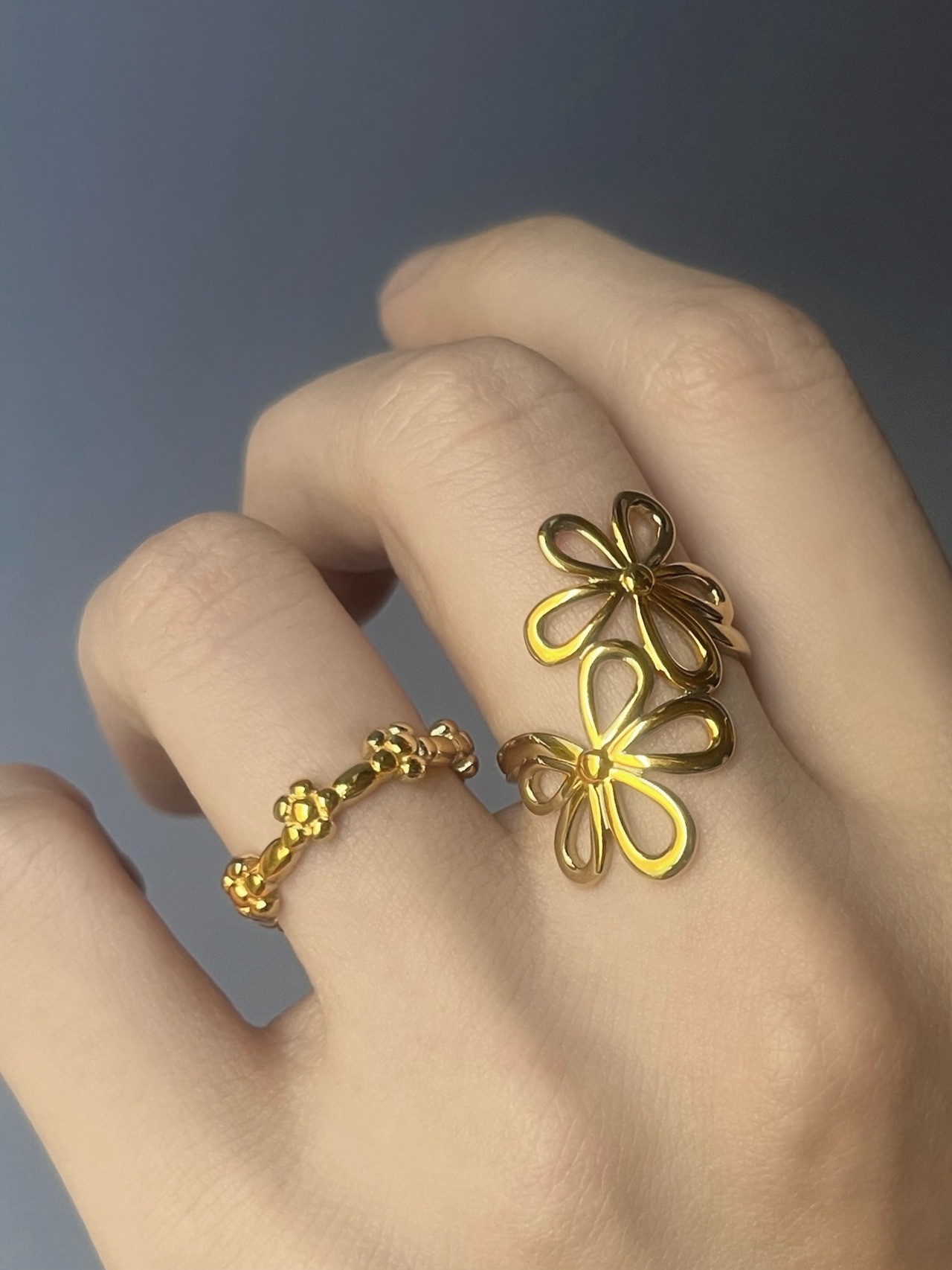 透かしデザインの花びらが指元に抜け感を生み出し、