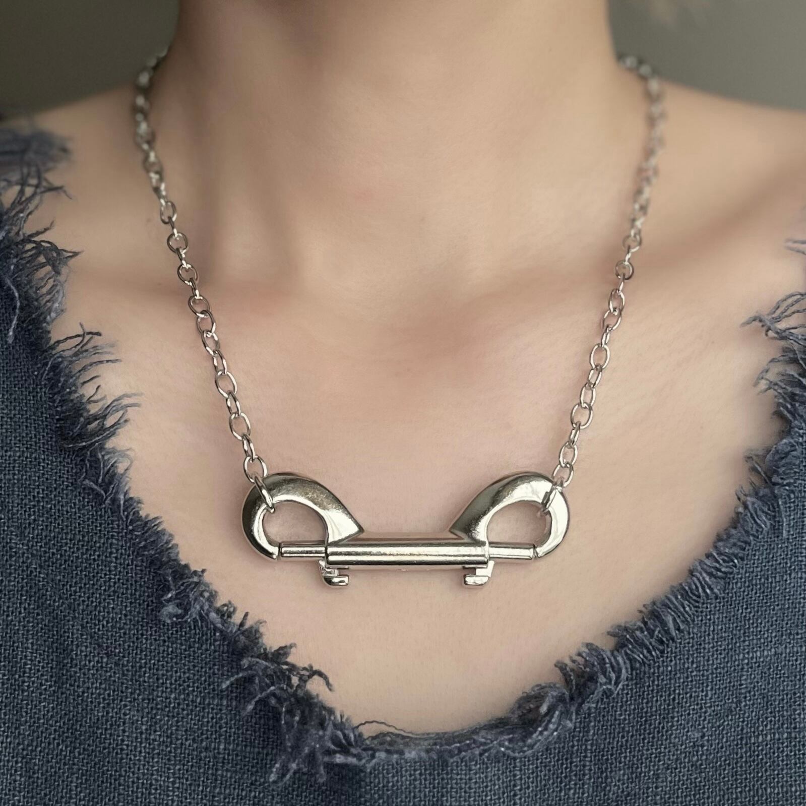 フック部分を開閉することで着脱するギミック感も楽しい重厚感がクールなチェーンネックレス。