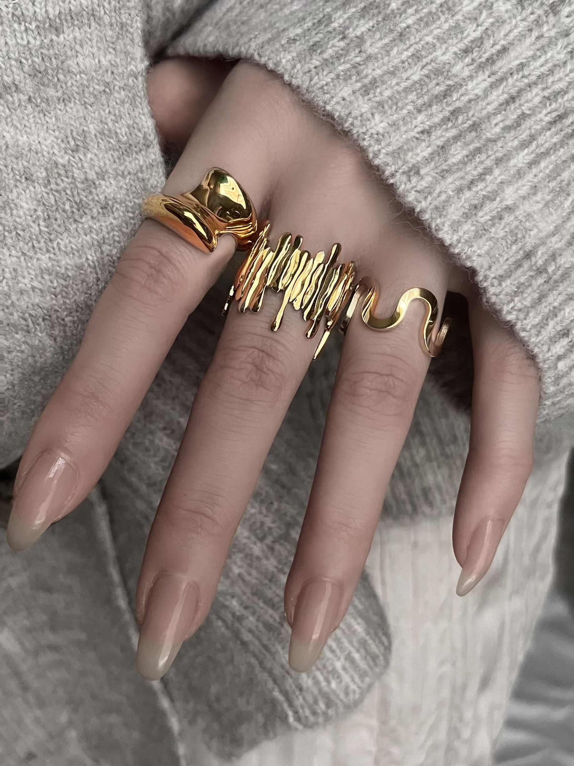 ニット素材とヴィンテージ調のゴールドアクセサリーの相性は抜群。