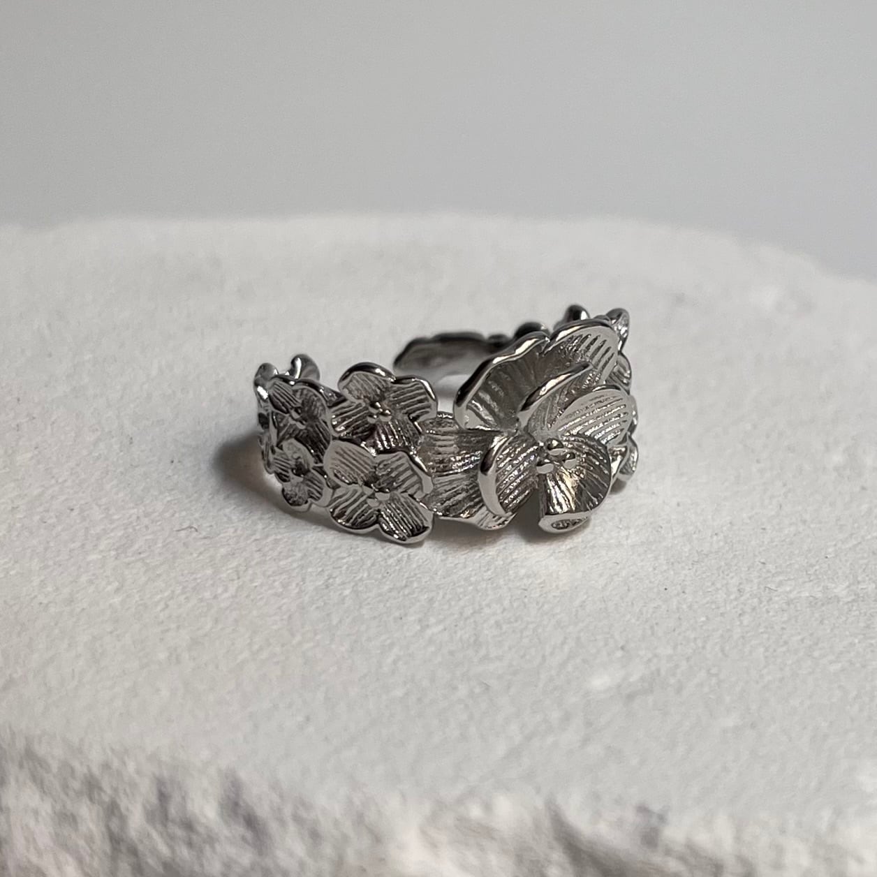 花びら一枚一枚を重ね合わせて立体感を持たせてデザインされたフラワーモチーフのリング。